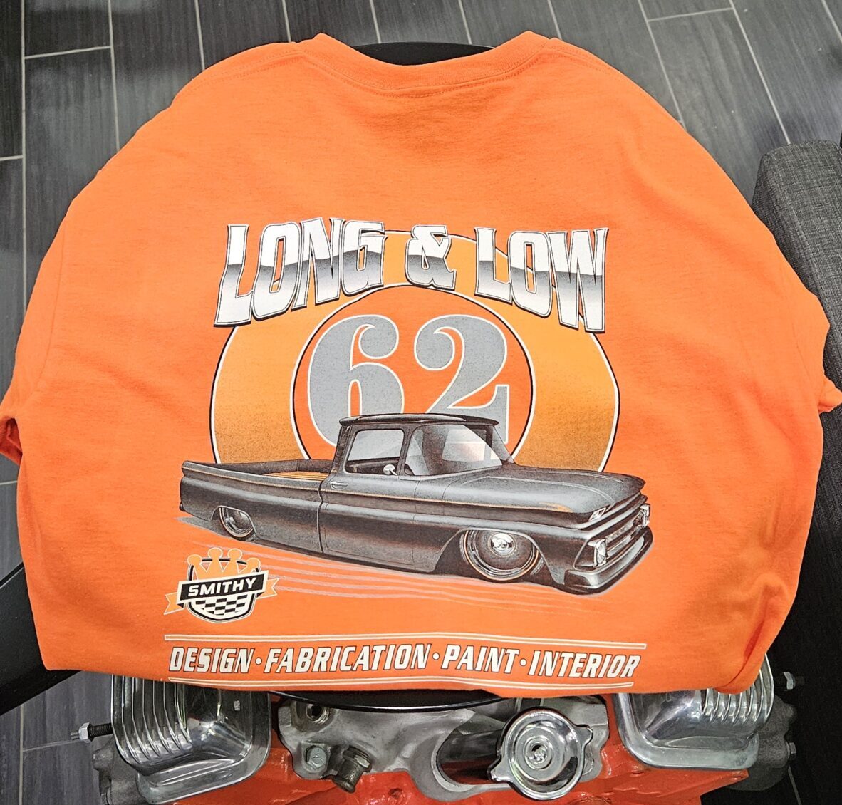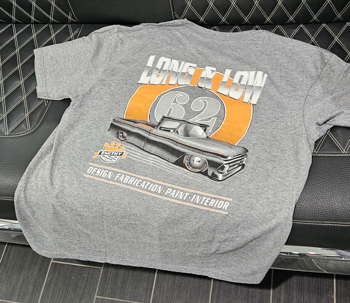 Gildan soft style tee with modern design and logo, 62 Truck Long & Low back design.